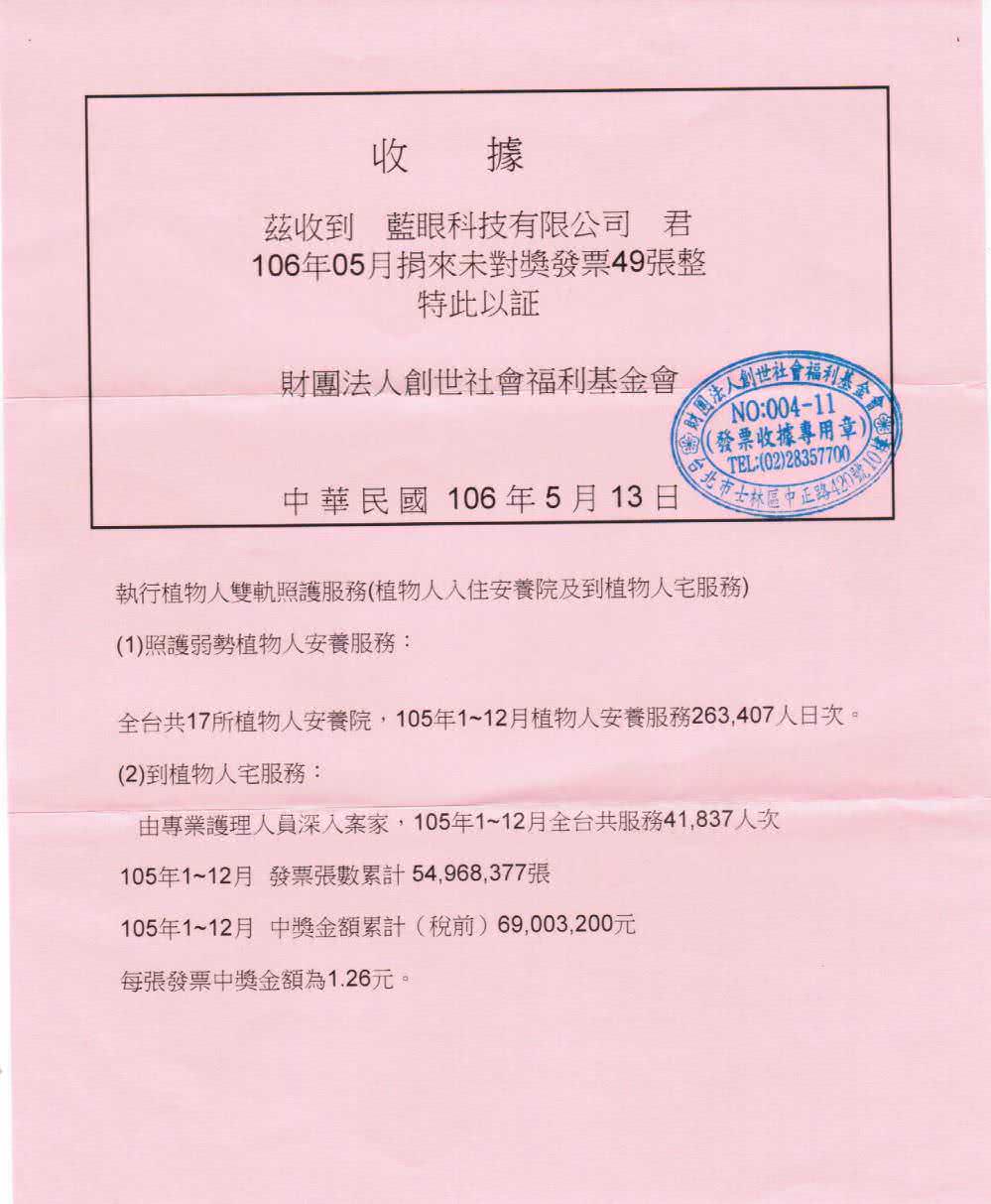 5. 您可以选择将发票捐赠 创世基金会 ,照顾植物人做社福,大家 多多捐发票 ,社会有温馨。